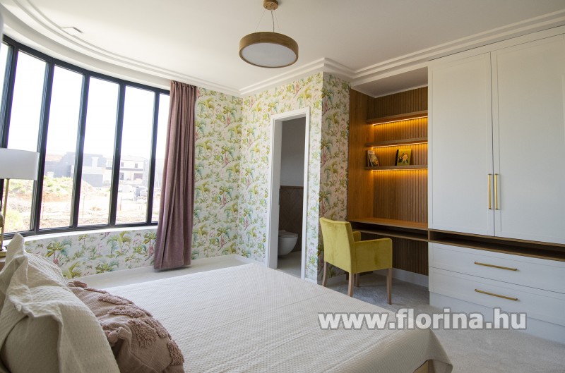 A ház 4 hálószobás, mindegyikhez tartozik egy saját fürdőszoba, plusz egy dolgozó szoba, a garázsba 2 autóval kényelmesen betudunk állni.