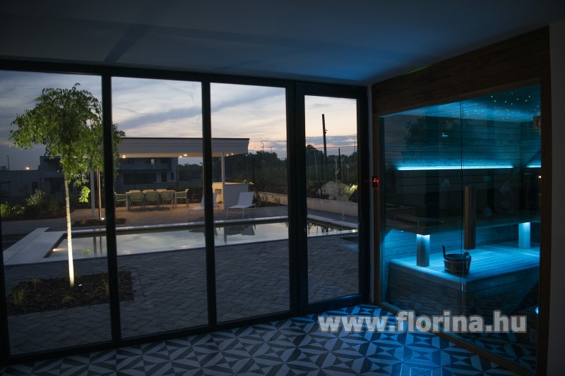 - 8 fÅ‘s finn szauna ledvilágÃtással mellette pihenÅ‘ rész és fürdÅ‘szoba.
